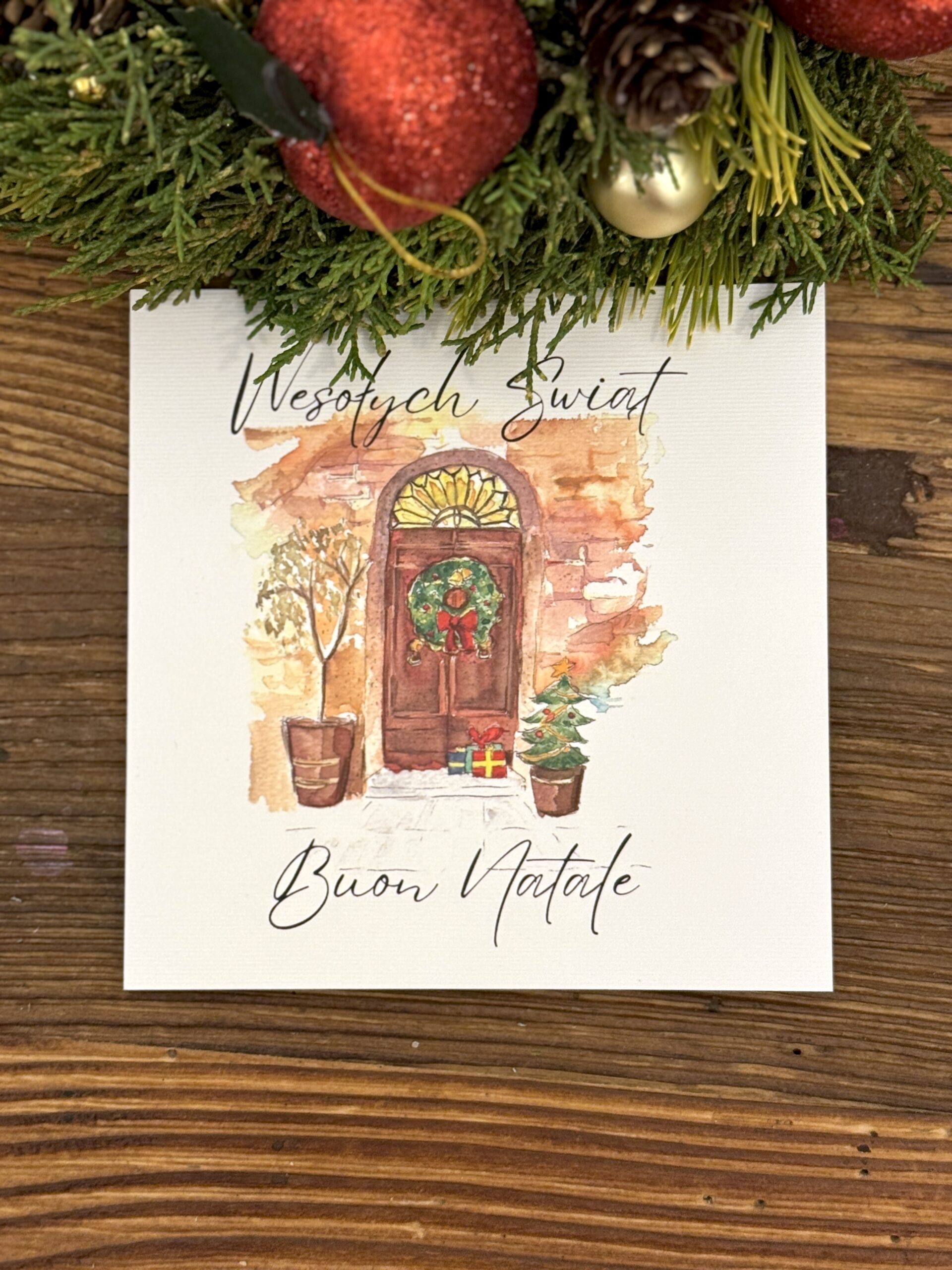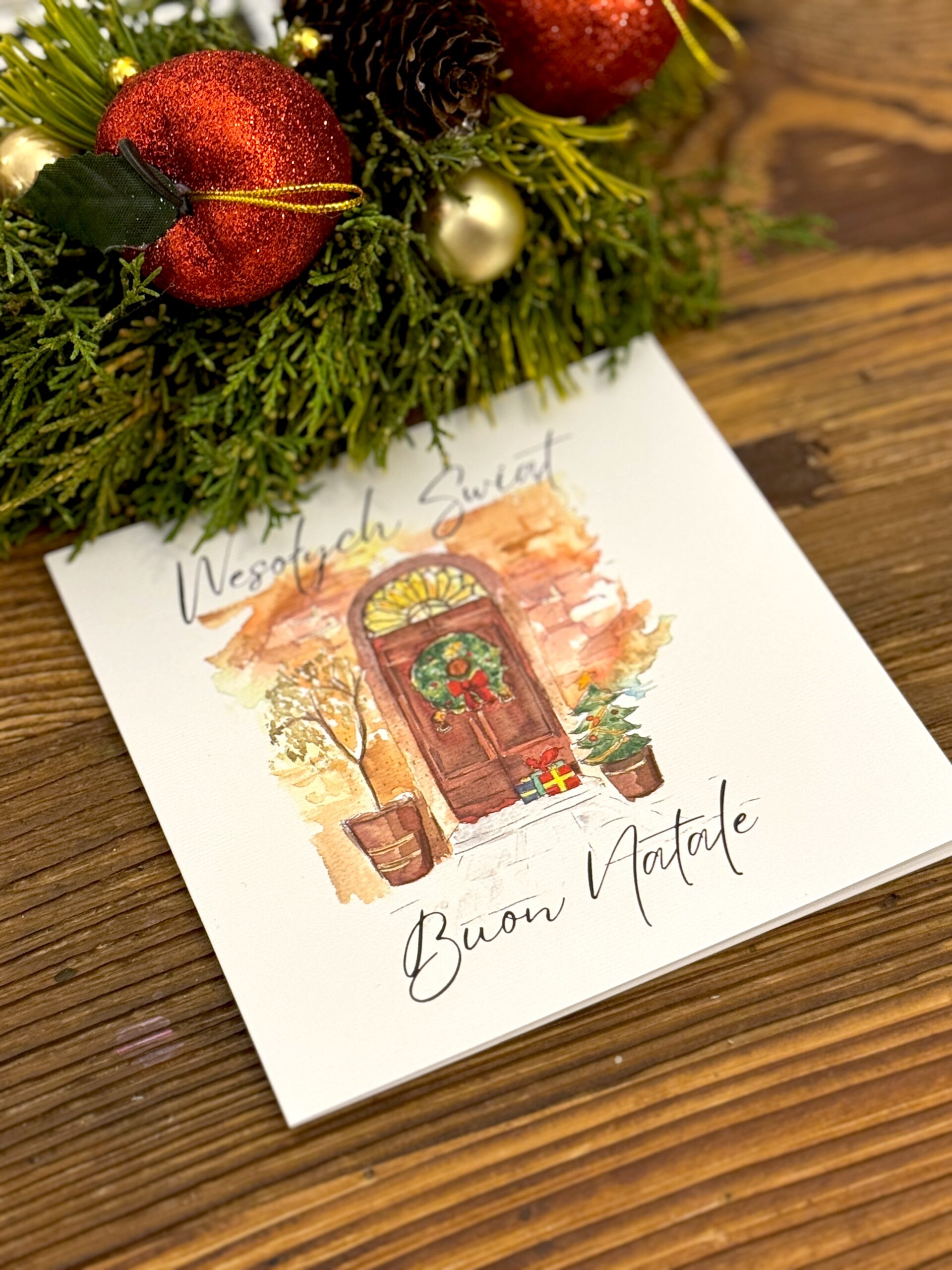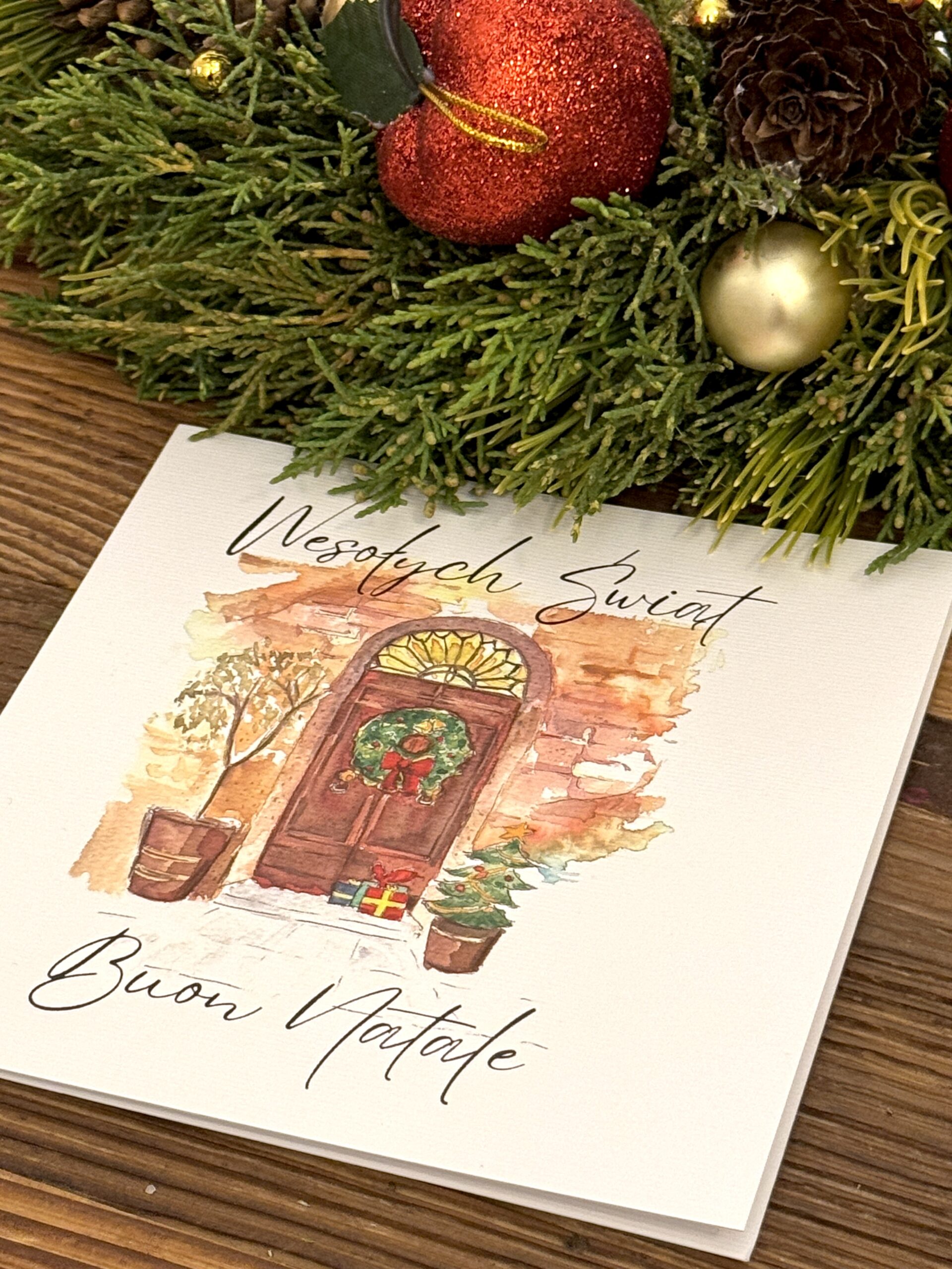 Podaruj komuś bliskiemu (lub sobie :)) kartkę świąteczną we włoskim klimacie z motywem udekorowanych świątecznie drzwi. Kartka jest w rozmiarze 14,5×14,5 cm i jest w zestawie z kopertą. Ilustracja była wcześniej przeze mnie ręcznie malowana, kupujesz wysokiej jakości print na fakturowanym grubym papierze. Kartka jest otwierane i puste w środku więc można wpisać własne życzenia. Na okładce ilustracja i życzenia świąteczne w obu językach – polskim i włoskim.