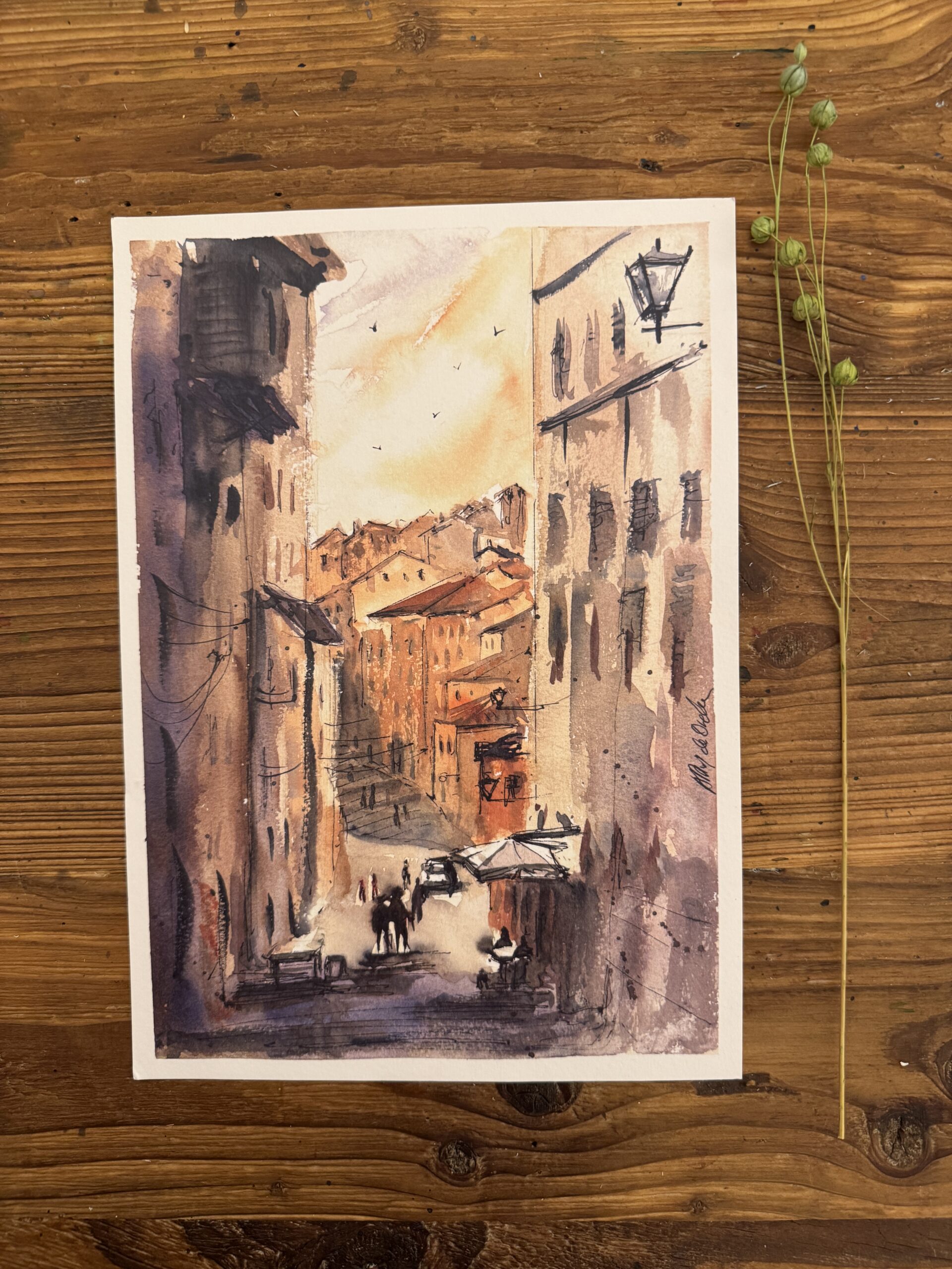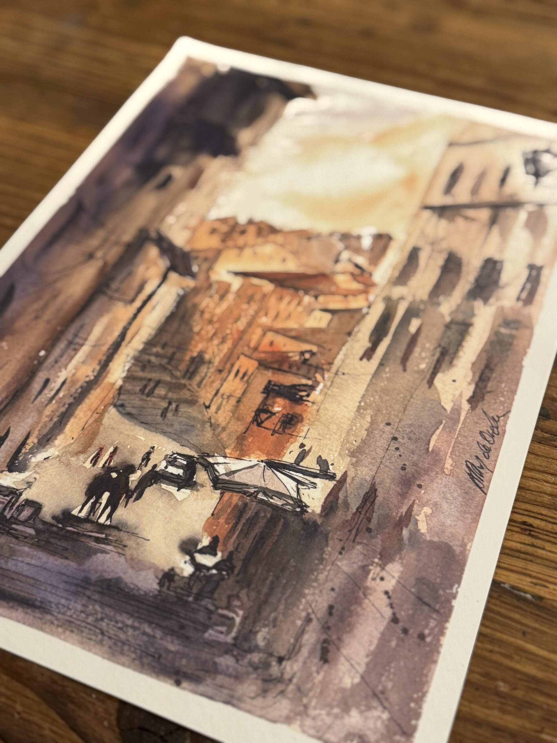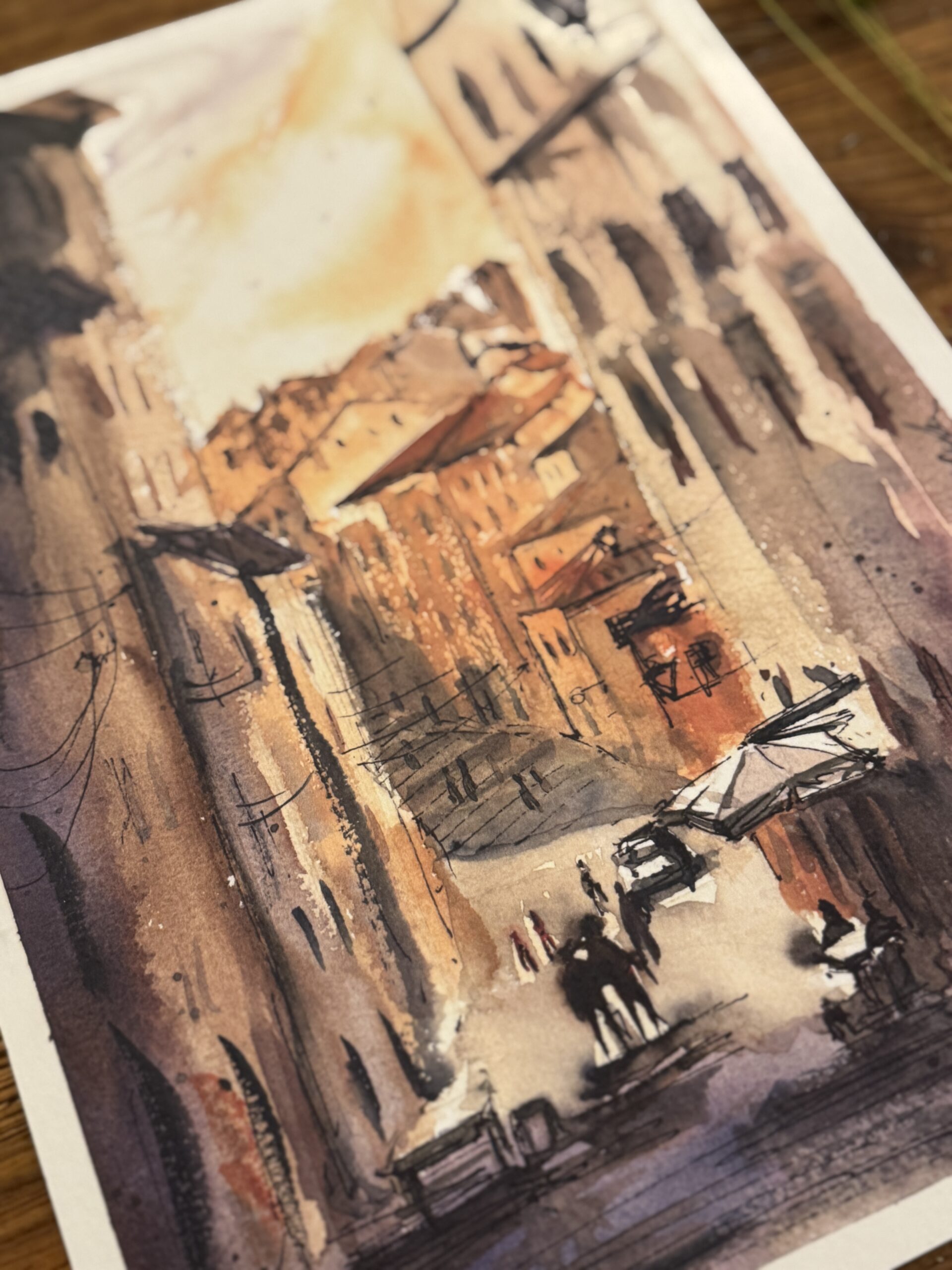 Delikatna technika akwareli nadaje scenie lekkość i autorski, ilustracyjny charakter. Ciepła paleta barw — ochry, ugru i złamanych czerwieni — oddaje atmosferę miasta, w którym historia i sztuka przeplatają się na każdym kroku.