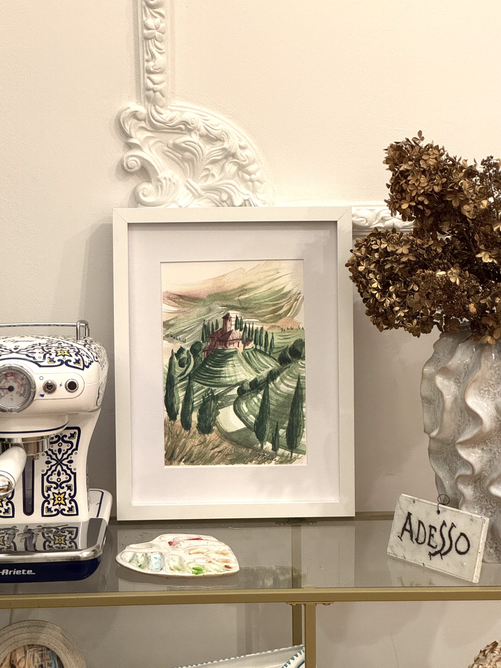 „Toskańskie wzgórze” to doskonały wybór dla osób, które kochają ilustracje o lekkim, pogodnym nastroju, cenią autorskie prace i chcą wprowadzić do swojego wnętrza odrobinę włoskiego słońca w subtelnej, akwarelowej formie.