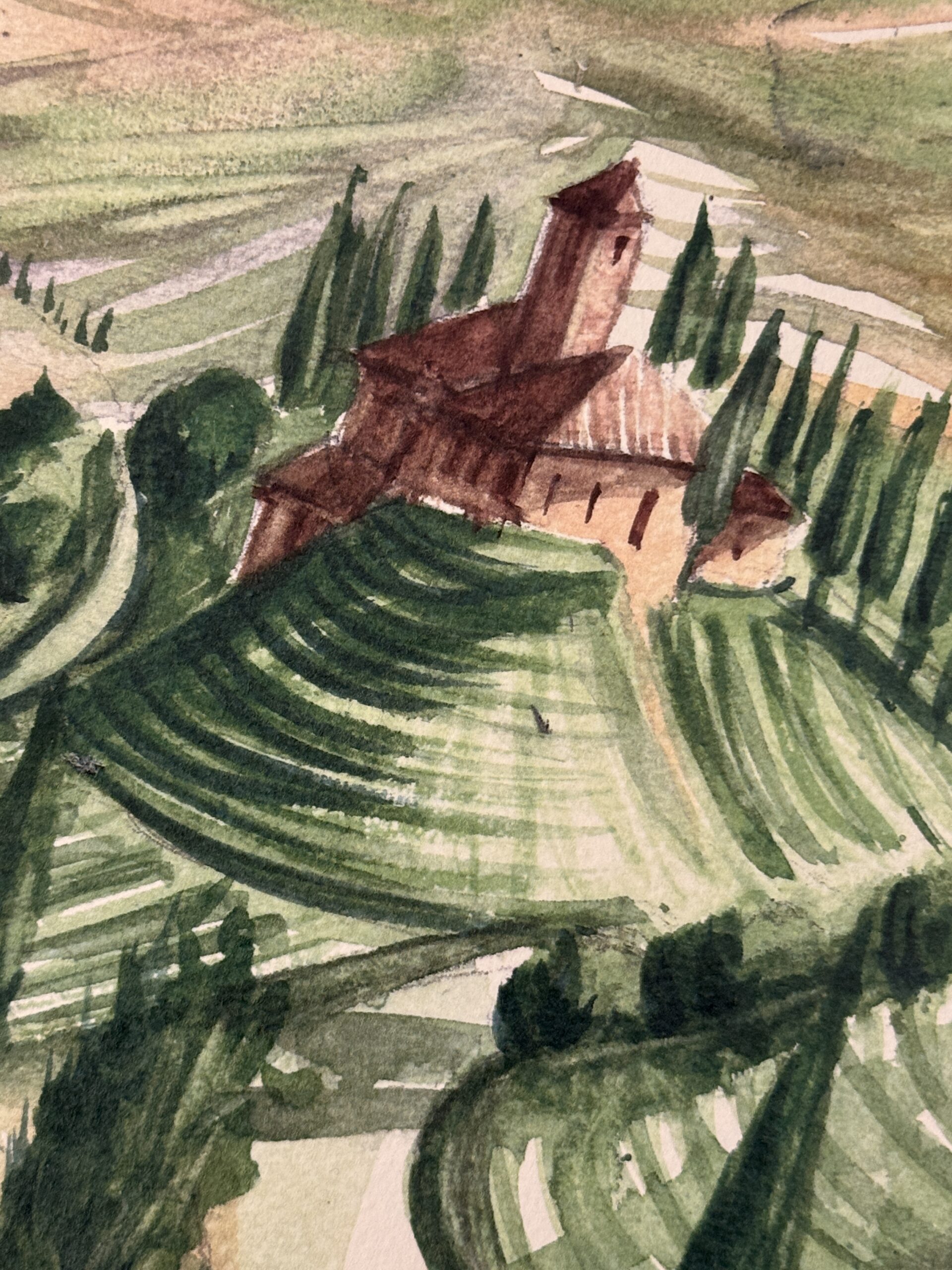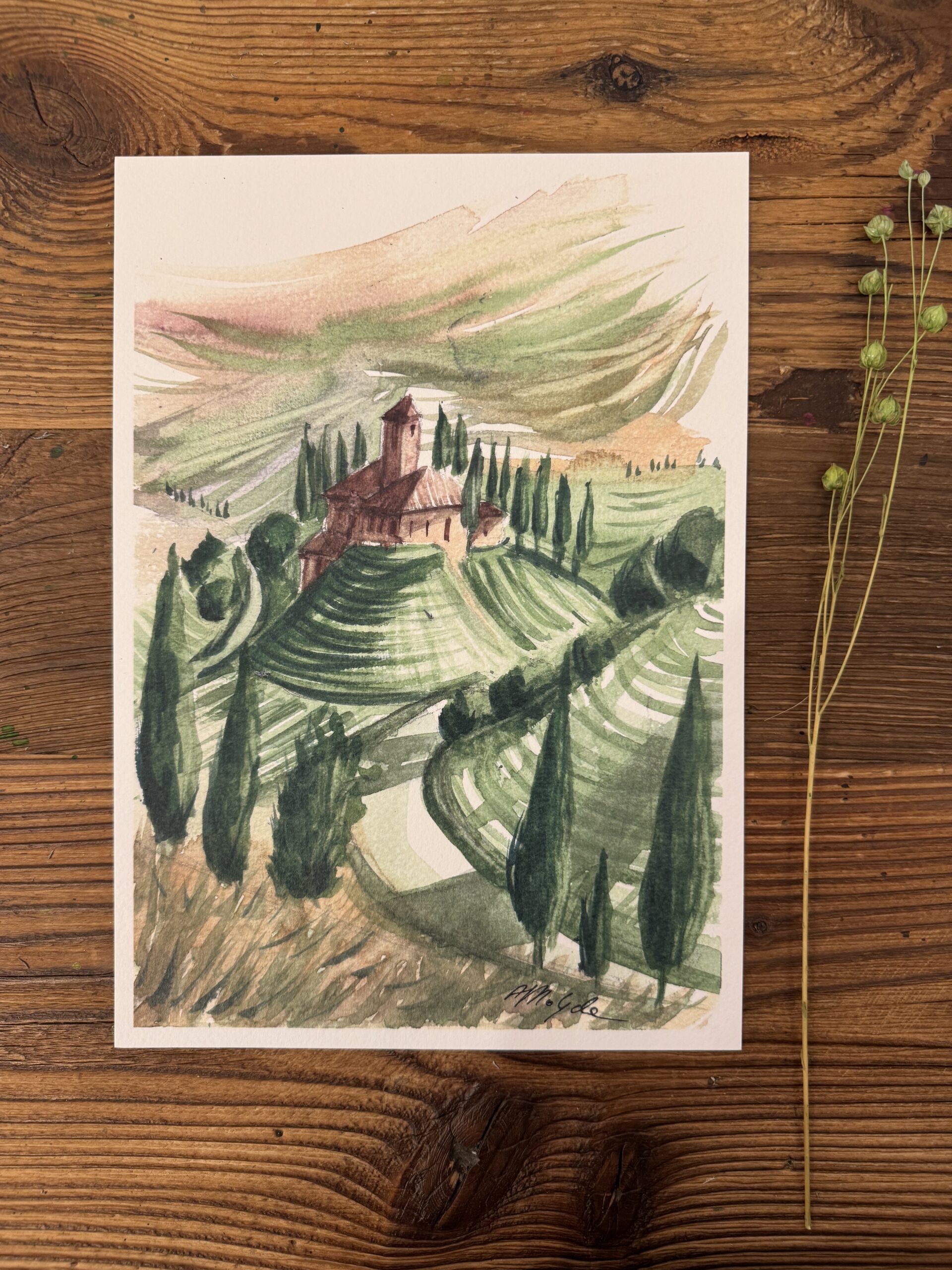 Ta akwarelowa ilustracja przenosi odbiorcę na słoneczne toskańskie wzgórza, gdzie miękkie, rozmyte barwy spotykają się z charakterystyczną lekkością malarstwa akwarelowego. Delikatne pociągnięcia pędzla podkreślają sielski krajobraz: łagodne pagórki, linię cyprysów i ciepłe światło, które subtelnie otula cały pejzaż.